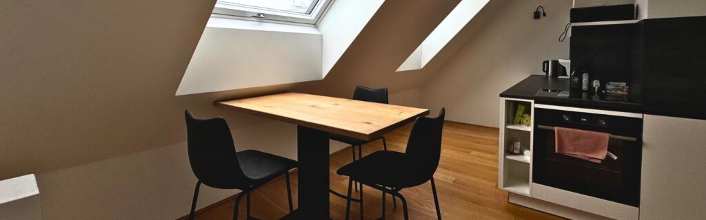 Die zweigeschossige, vollmöblierte Wohnung hat 64m2 und besteht aus einer Wohnküche, einem Schlafzimmer mit Doppelbett, einem Bad mit WC und einer 28m2 großen Dachterrasse. Der Bahnhof und andere öffentliche Verkehrsmittel wie Bus und Straßenbahn sind zu Fuß in 10 Minuten erreichbar. Mit dem Auto ist man in 5 Minuten auf der Autobahn A7 und in 10 Minuten in der Zentrale in Urfahr (öffentlich ca. 20 Minuten).